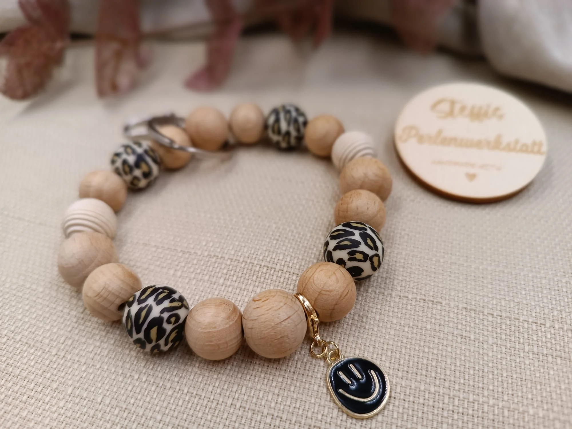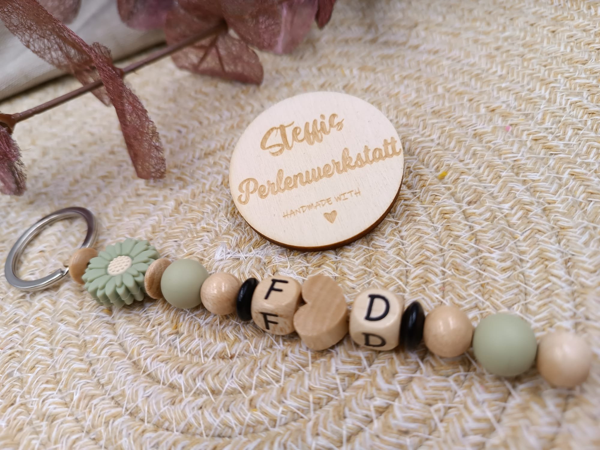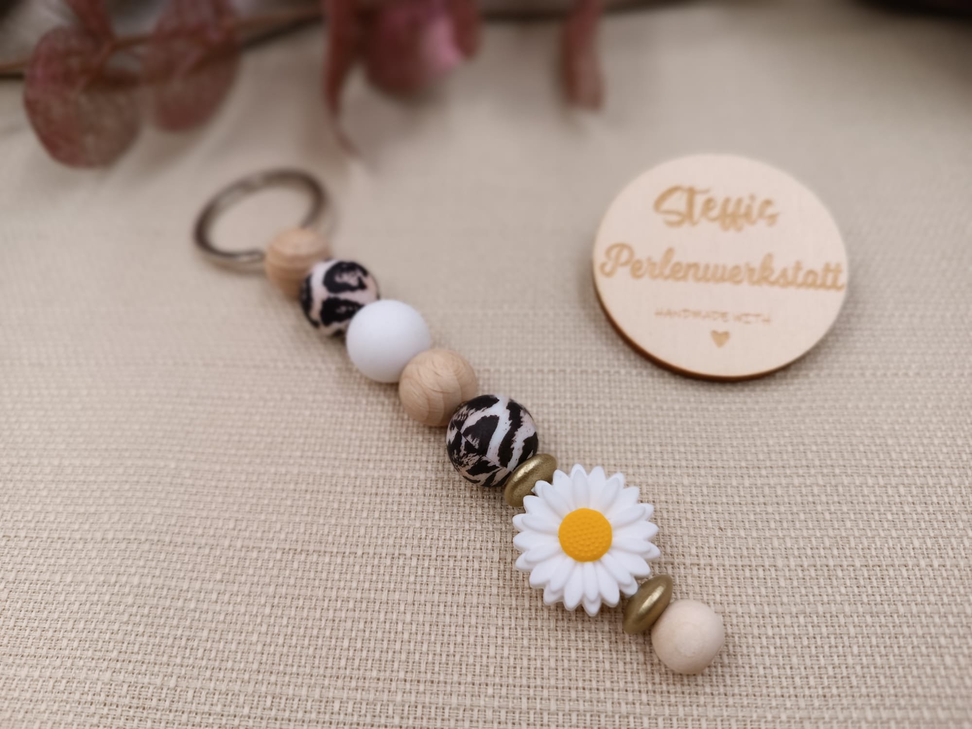 Schlüsselanhänger leo/natur bestehend aus Holz- und Silikonperlen, Motivperle "Blume". Preis 7 Euro
