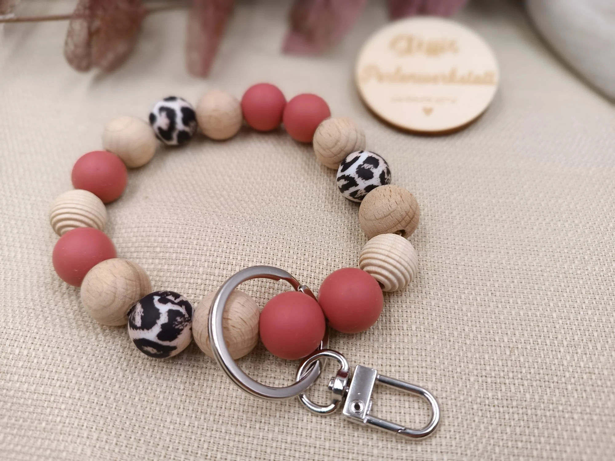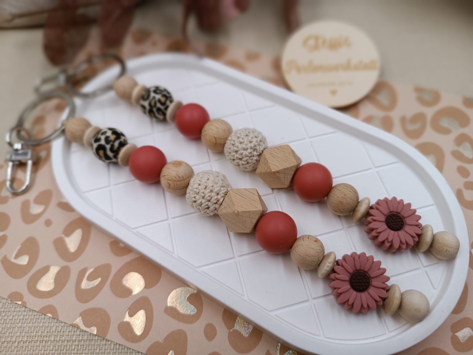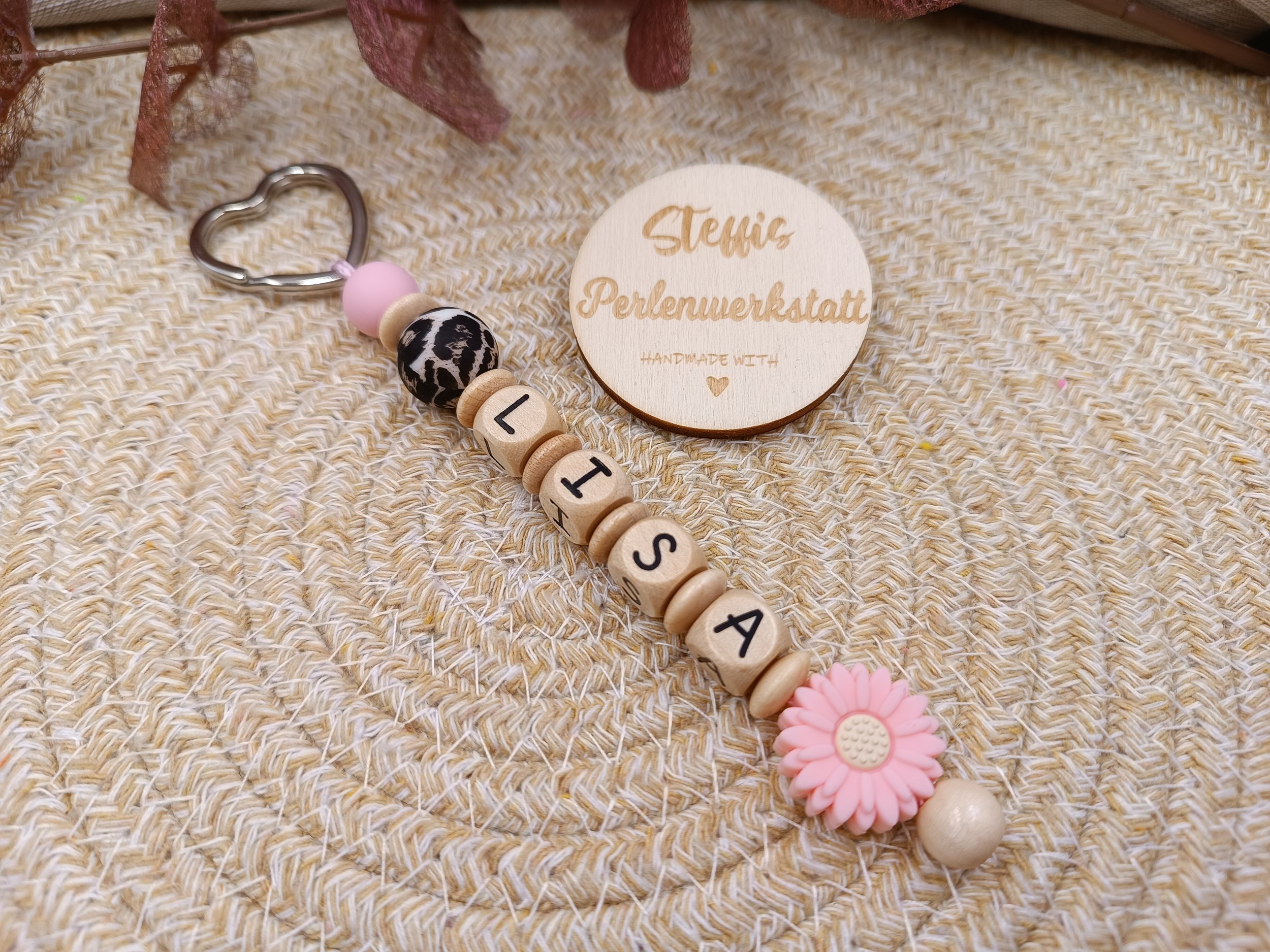 Schlüsselanhänger rosa/leo bestehend aus Holz- und Silikonperlen, Motivperlen "Blume". Preis 9 Euro