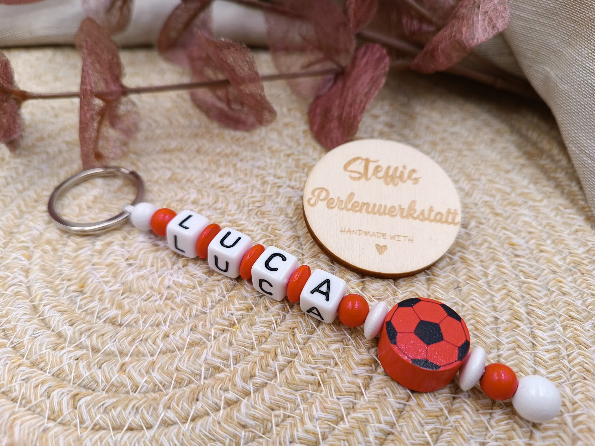 Schlüsselanhänger natur/rot bestehend aus Holzperlen, Motivperle "Fußball". Preis 9 Euro