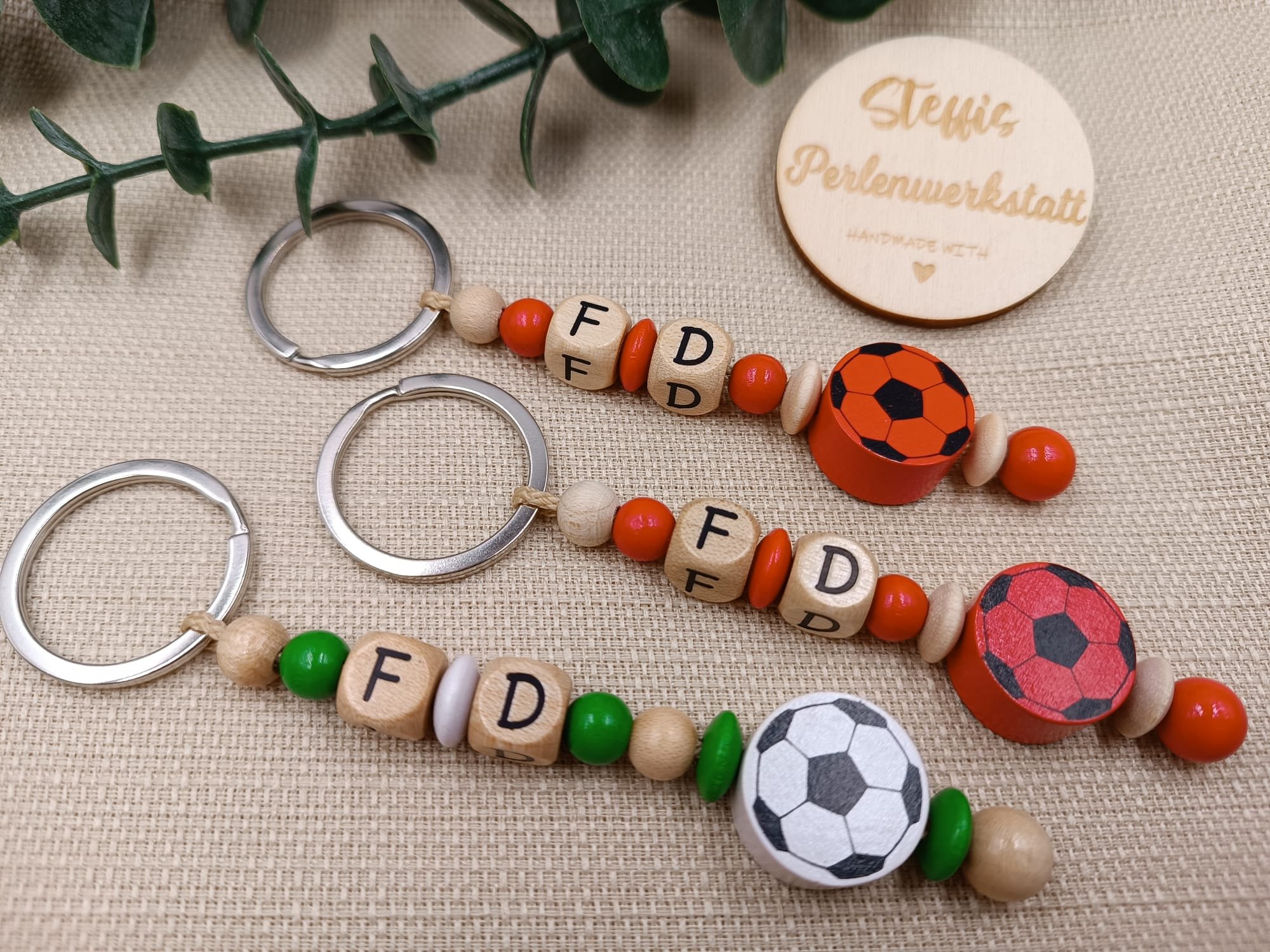 Schlüsselanhänger natur/rot bzw. natur/grün bestehend aus Holzperlen, Holzbuchstaben, Motivperlen "Fußball" Preis ab 7 Euro