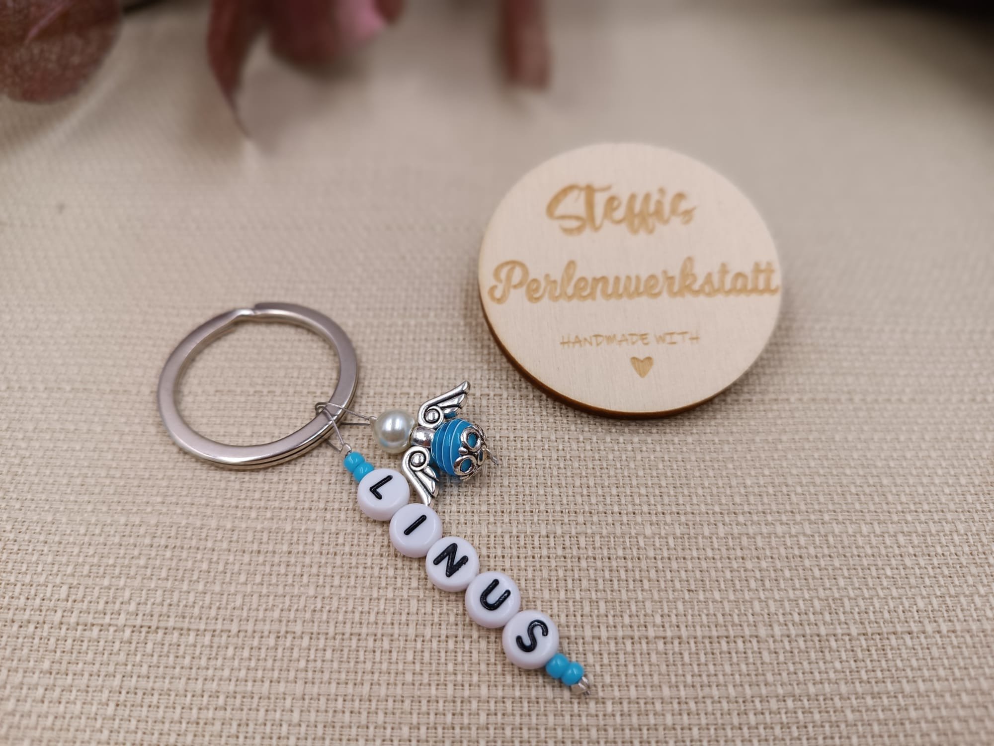 Schlüsselanhänger auf Schmuckdraht bestehend aus Glasperlen, Kunststoffbuchstaben, mit Engelchen. Preis ab 6 Euro