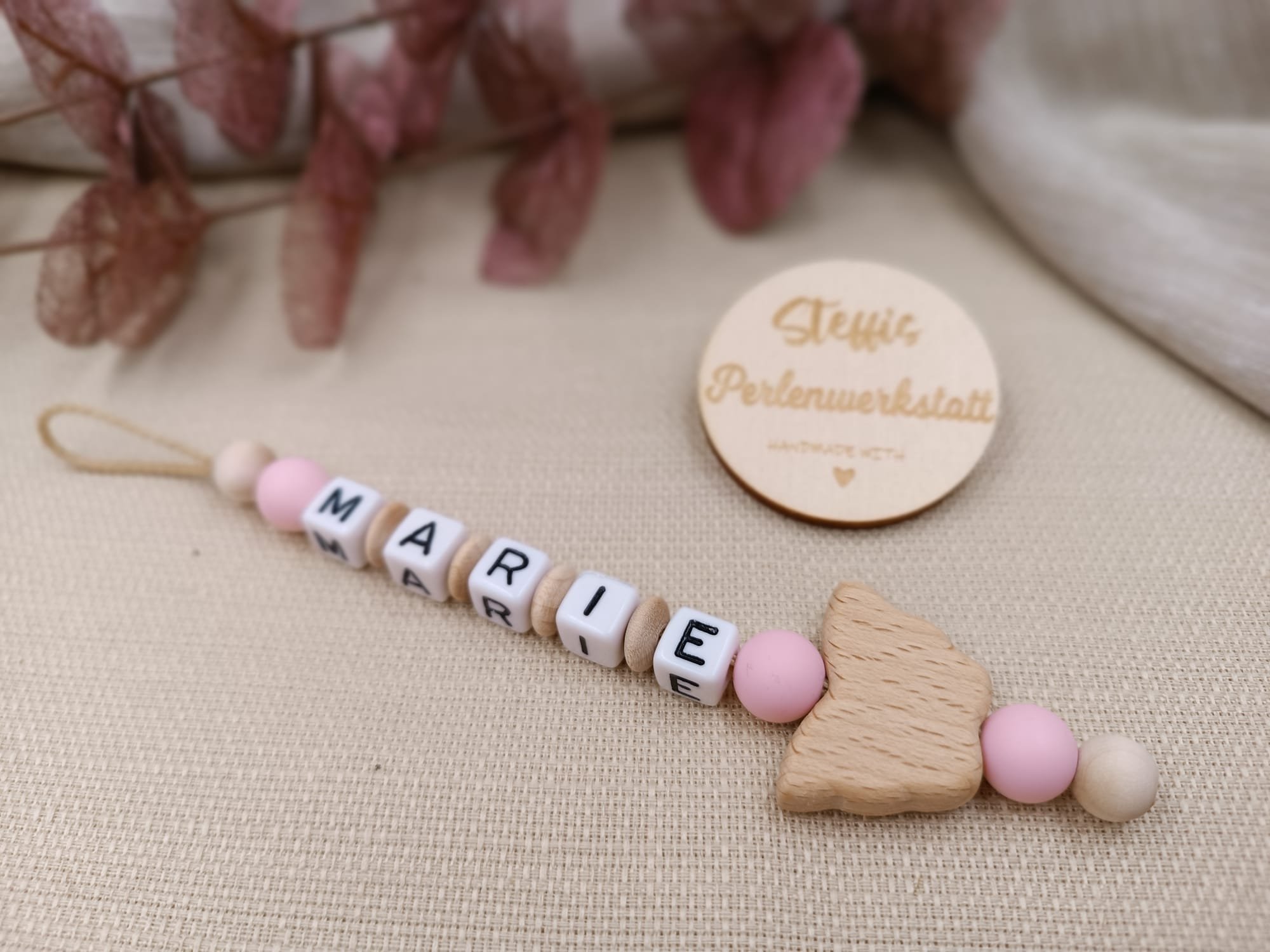 Schlüsselanhänger natur/rosa bestehend aus Holz- und Silikonperlen, Kunststoffbuchstaben und Motivperle "Schmetterling". Preis ab 8 Euro