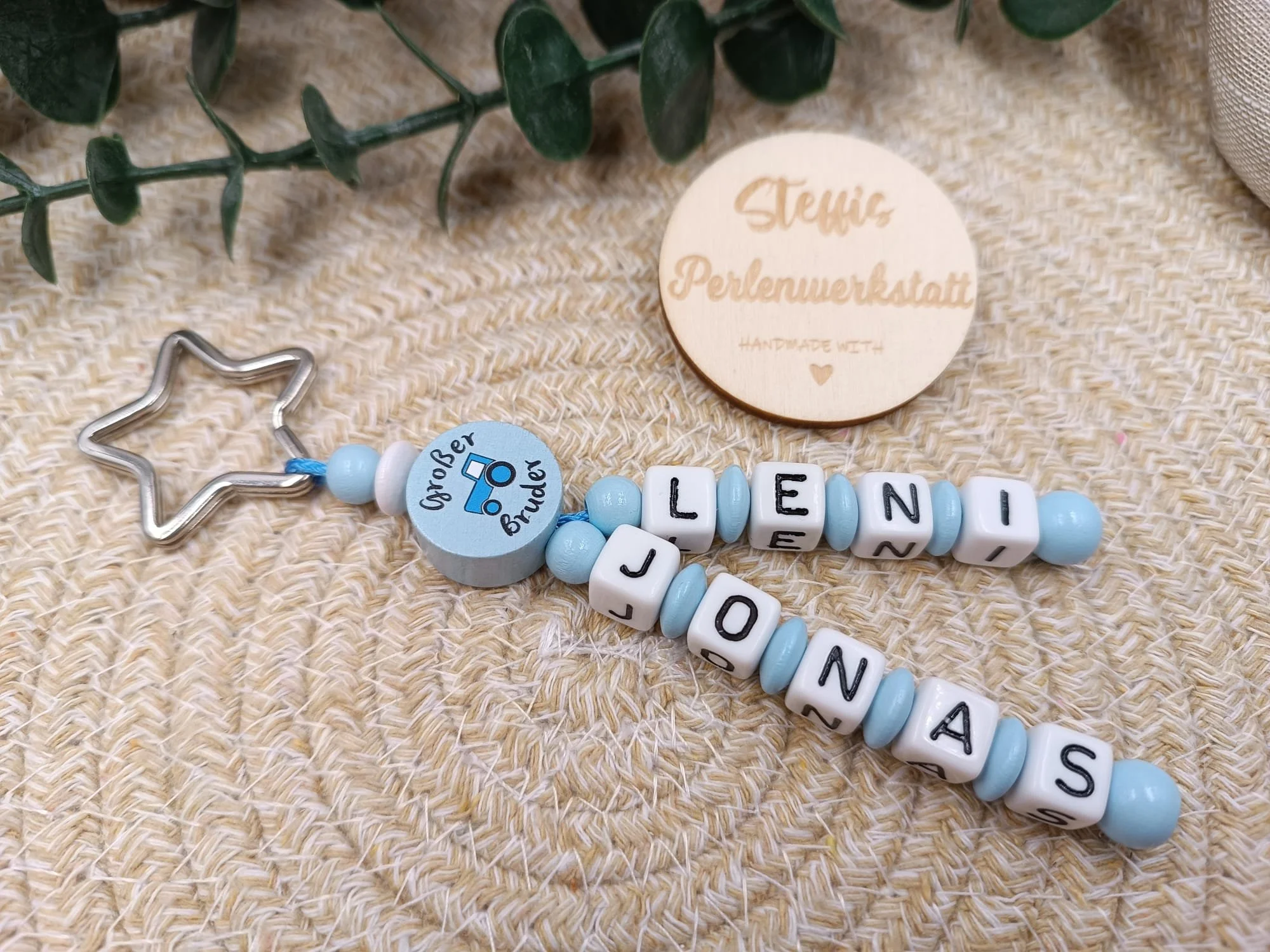 Schlüsselanhänger babyblau/weiß bestehend aus Holzperlen, Motivperle "großer Bruder". Preis ab 9 Euro
