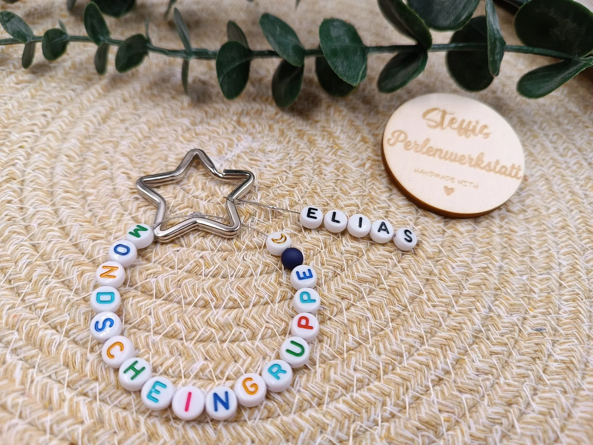 Schlüsselanhänger auf Schmuckdraht bestehend aus Glasperlen, Kunststoffbuchstaben. Preis ab 6 Euro