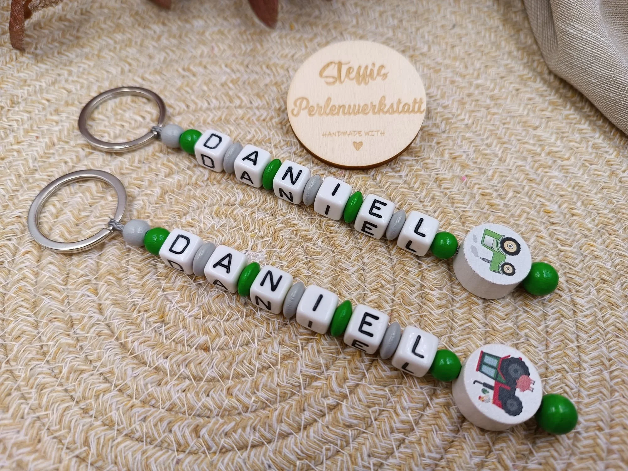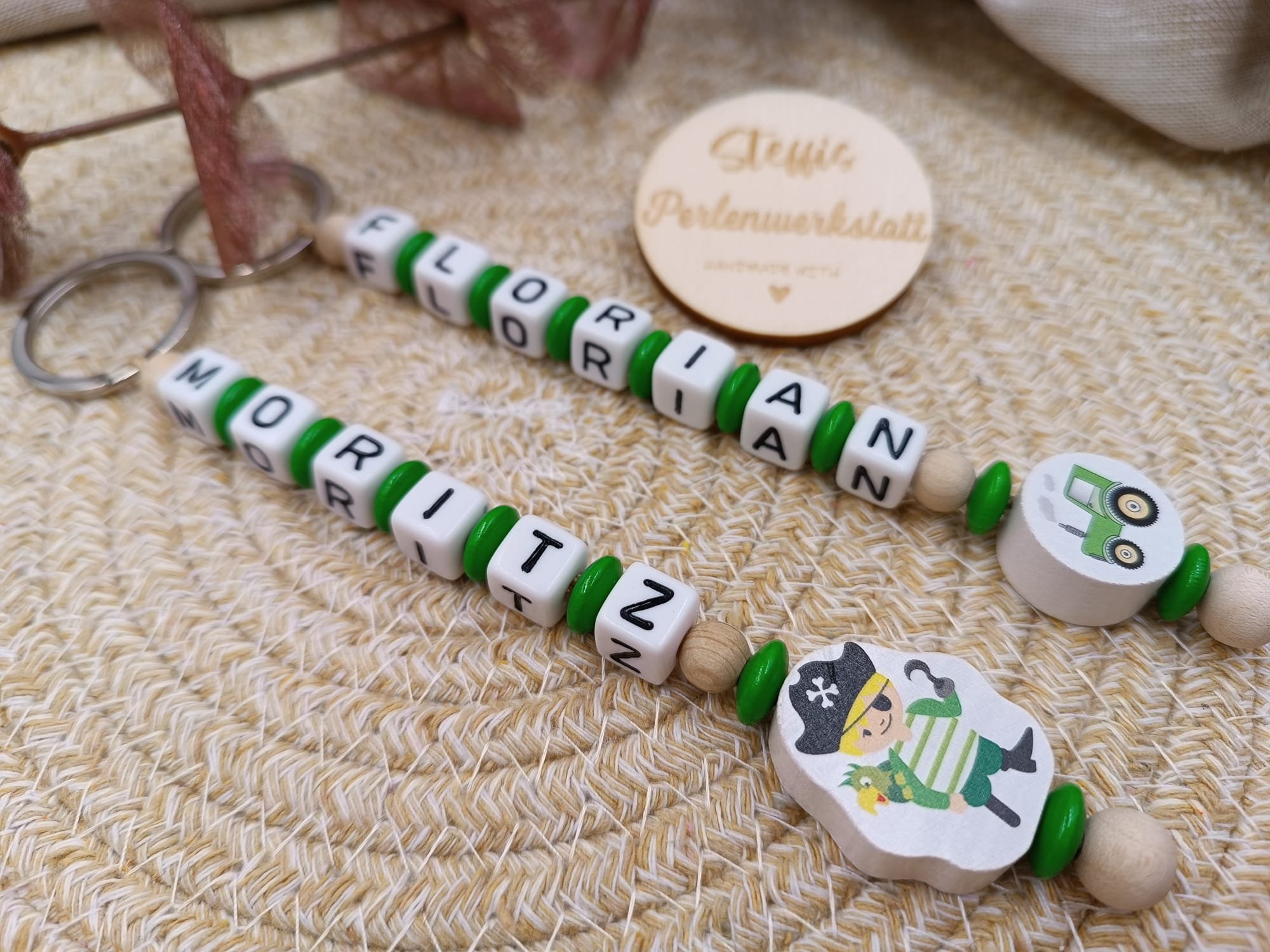 Schlüsselanhänger grün/natur bestehend aus Holzperlen, Kunststoffbuchstaben, Motivperlen "Traktor" bzw. "Pirat". Preis je ab 9 Euro