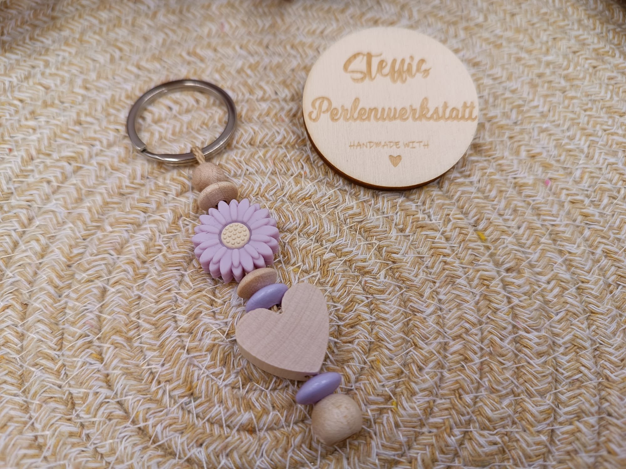 Schlüsselanhänger natur/flieder bestehend aus Holz- und Silikonperlen, Motivperlen "Blume" & "Herz". Preis 7 Euro