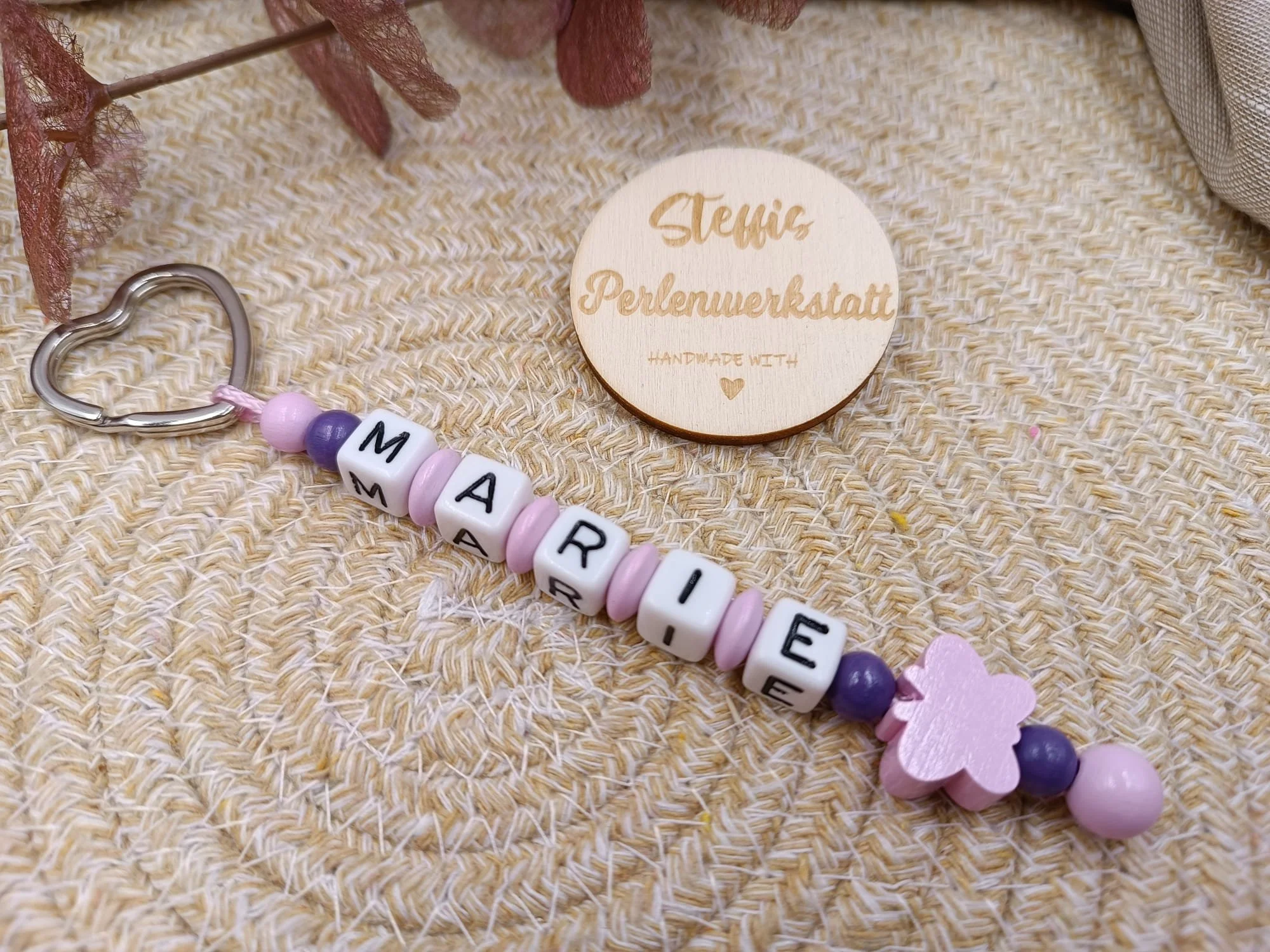Schlüsselanhänger lila/rosa bestehend aus Holzperlen, Kunststoffbuchstaben, Motivperle "Schmetterling" Preis ab 8 Euro
