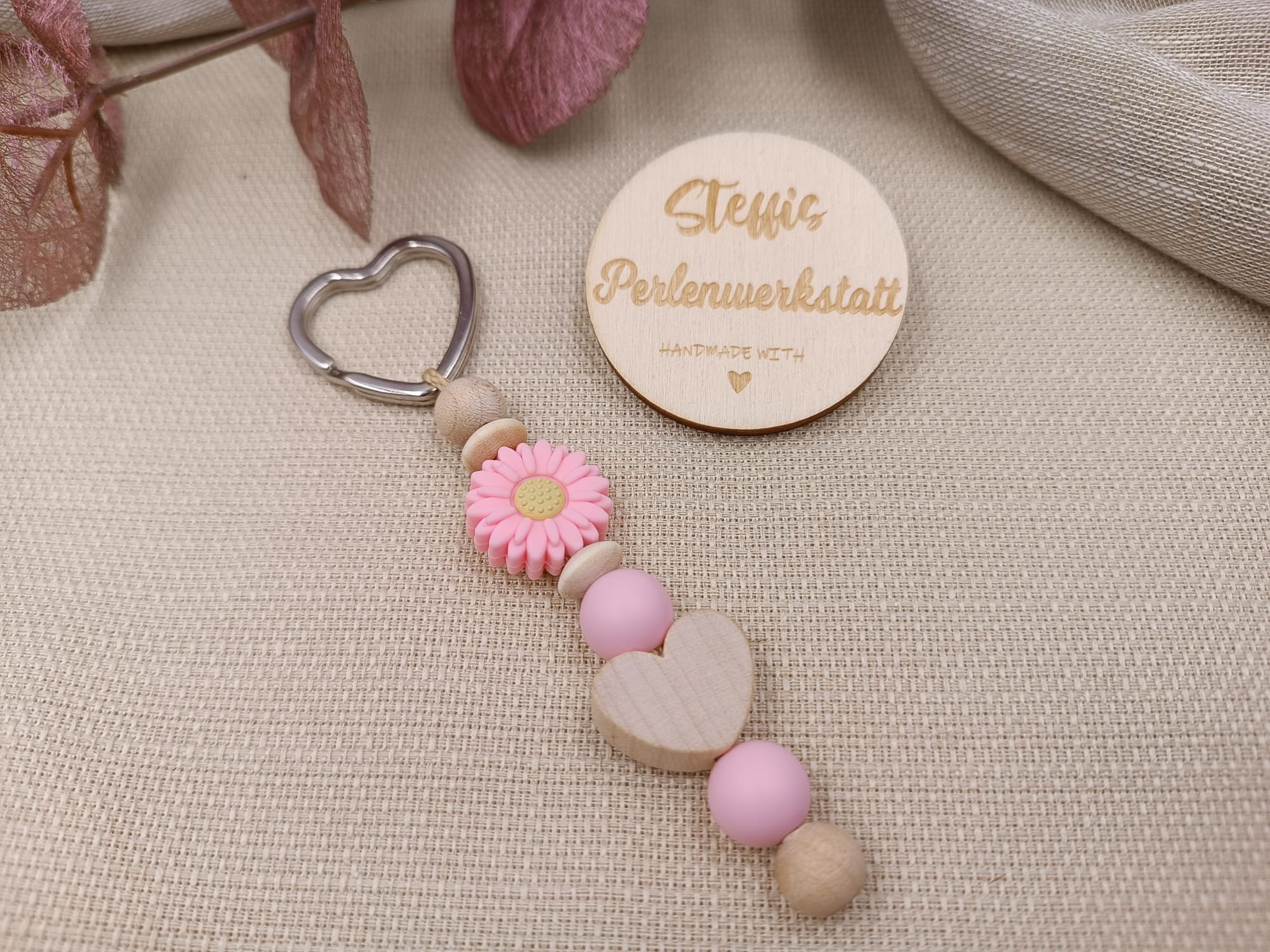 Schlüsselanhänger natur/rosa bestehend aus Holz- und Silikonperlen, Motivperlen "Blume" & "Herz". Preis 7 Euro