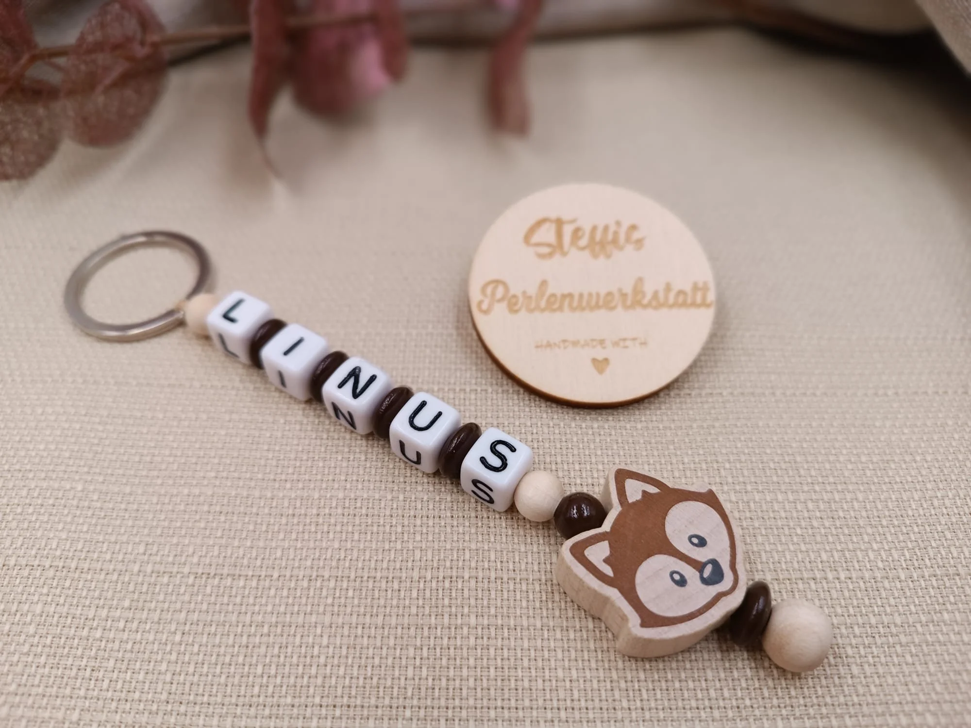 Schlüsselanhänger natur/braun bestehend aus Holzperlen, Kunststoffbuchstaben, Motivperle "Fuchs". Preis ab 8 Euro